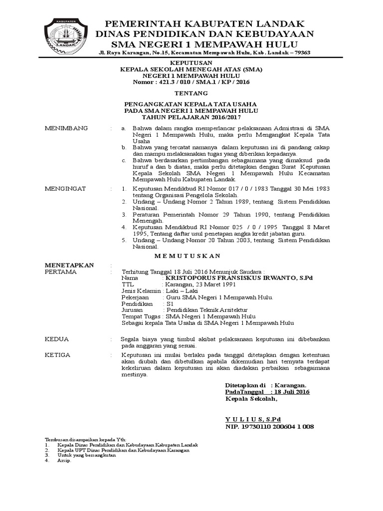 Sk Pembagian Tugas Mengajar Sma Doc : Contoh Format Sk Tugas Pembagian Tugas Guru Tahun Pelajaran 2017 2018 Dadang Jsn : Surat keputusan sk pembagian tugas mengajar merupakan salah satu bagian administrasi guru yang penting karena di gubakan sebagai bukti fisik jika ada monev.. Sususnan penulisan surat keputusan pembagian tugas mengajar bagi guru guru di setiap sekolah yang di maksudkan sebagai suat keputusan untuk mengajar bagi gur guru pengajar di sekolah masing masing. Kumpulan format sk membagian tugas mengajar dan beban kerja guru tahun pelajaran 20192020. Lahir l/p ijazah tugas mengajar / mata pelajaran jabatan jumlah jam/ kelas jtm tb jbk vii viii ix 1. Contoh sk guru paud ini hanya sebagai referensi yang mungkin sesuai untuk diterapkan dilembaga anda. Semua aktivitas itu bermuara pada peserta didik yang berilmu pengetahuan, berbudi pekerti luhur dan.
